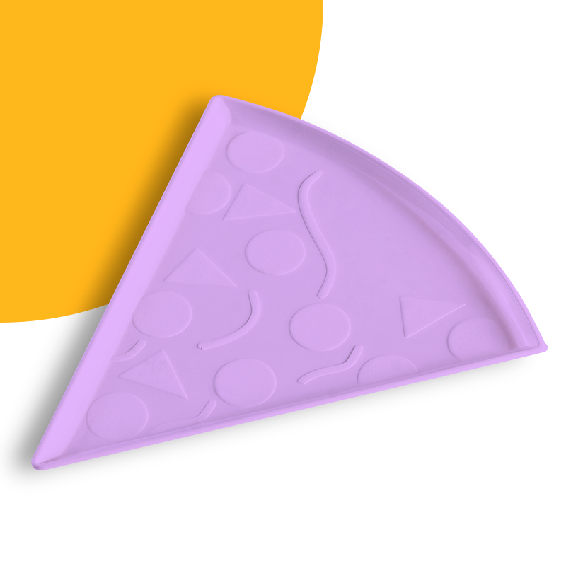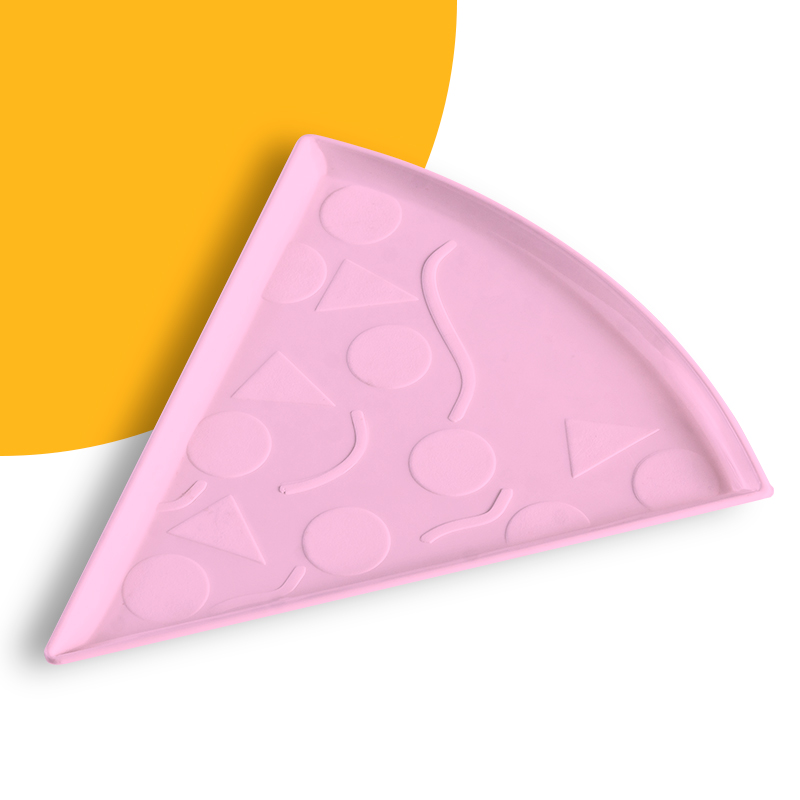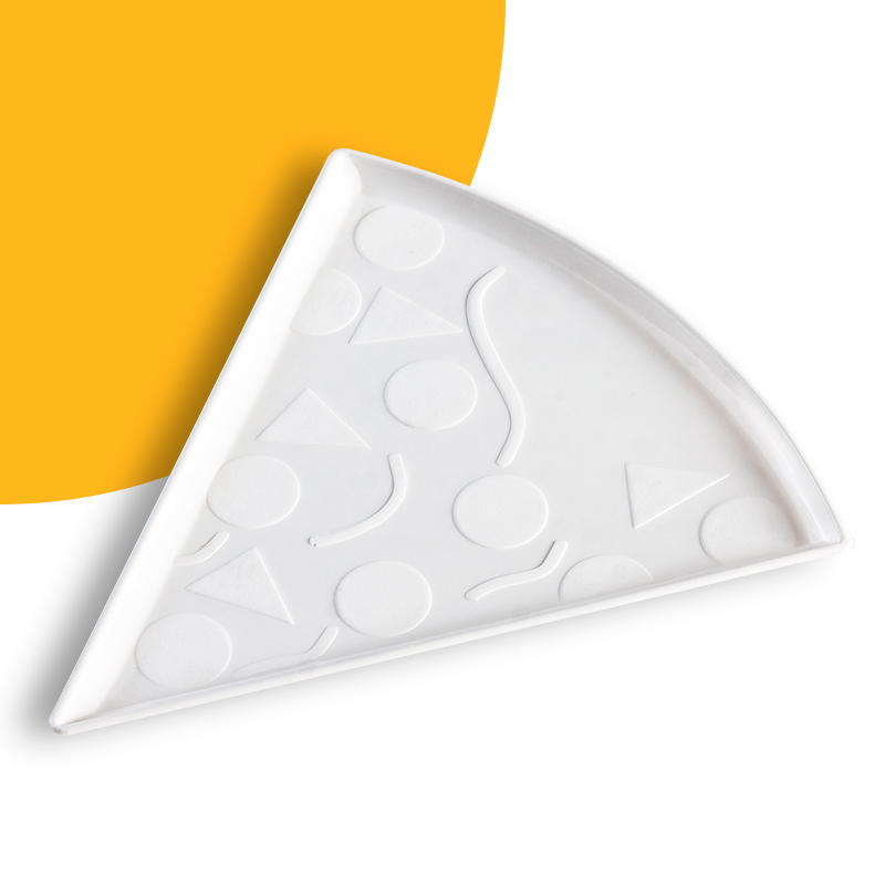 Plato para pizza triangular, fabricado en plástico de uso alimenticio muy resistente que soporta el calor.  Está diseñado para servir porciones de pizza en su tamaño justo.
