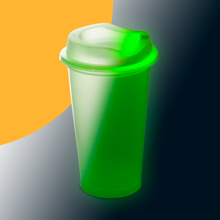 Práctico vaso cafetero plástico con tapa, tiene una capacidad de 16OZ listo para iniciar el día de trabajo.